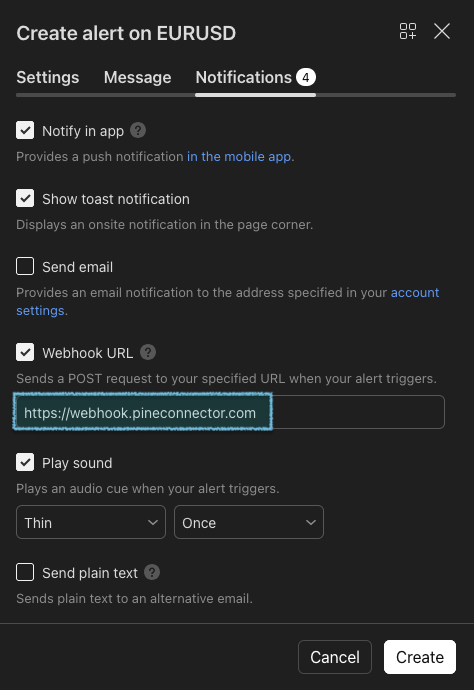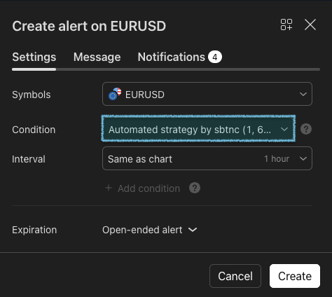 7. Once it’s done, you can now create your alert. Select the strategy as the condition and fill in the webhook URL.